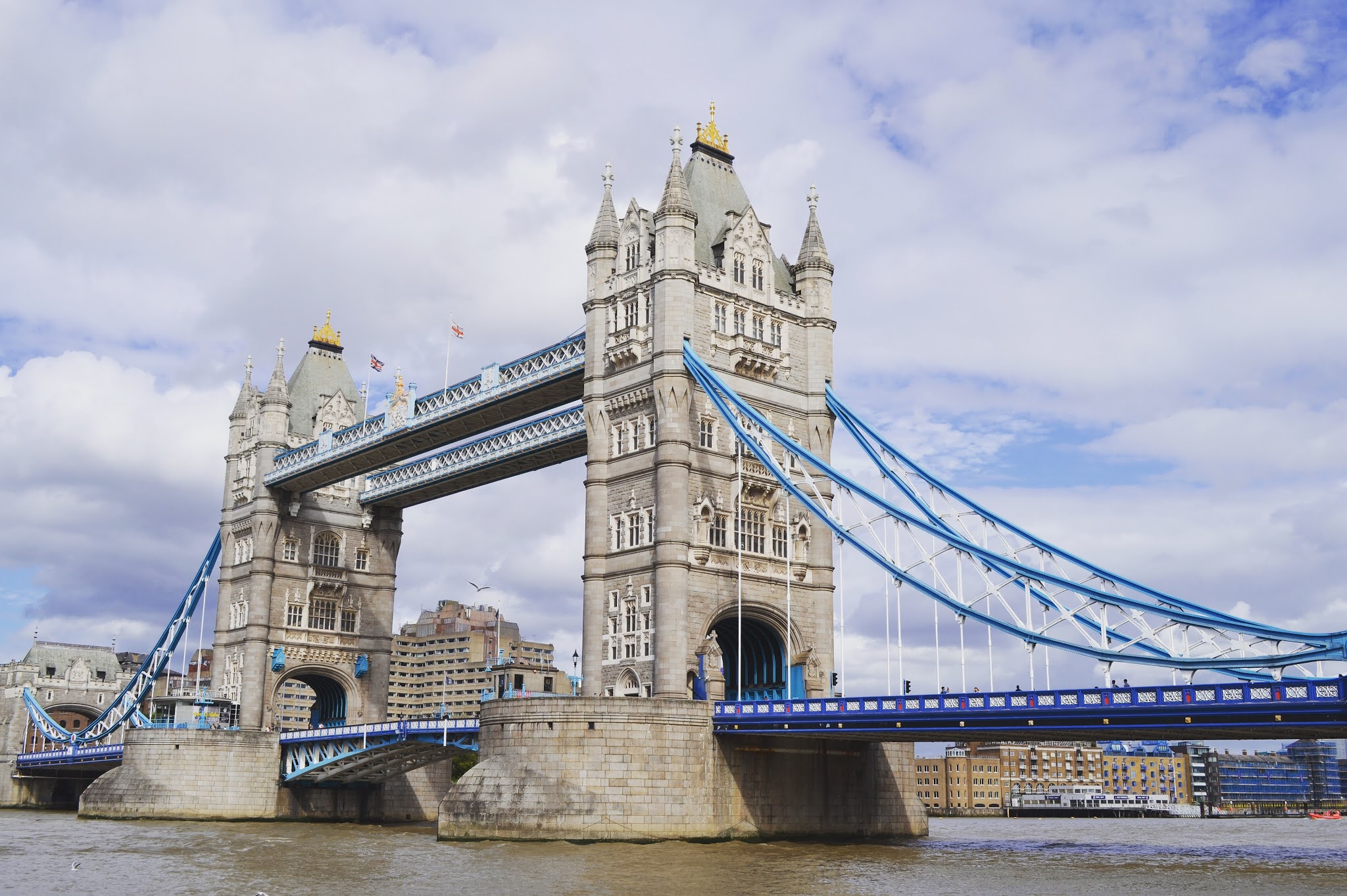 Tower Bridge is a combined bascule and suspension bridge. The bridge crosses the River Thames close to the Tower of London and has become a world-famous symbol of London. The bridge consists of two bridge towers tied together at the upper level by two horizontal walkways.